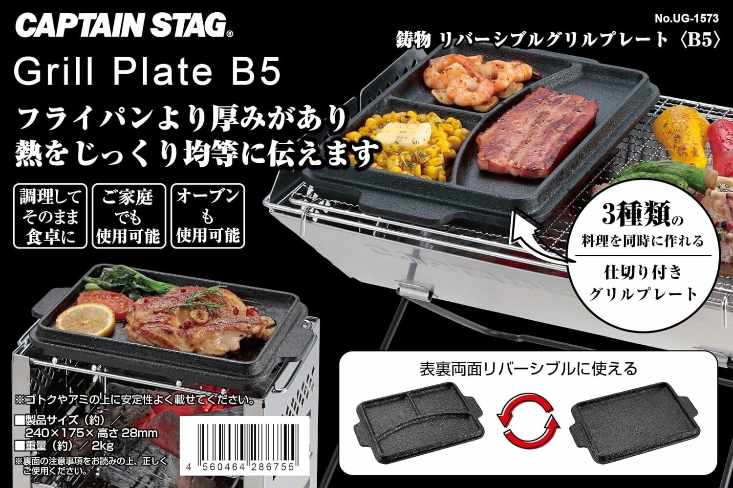 表裏両面リバーシブルに使えるグリルプレート。フライパンより厚みがあり熱をじっくり均等に伝えます。3種類の料理を同時に作れる仕切り付き。調理してそのまま食卓に。ご家庭でも使用可能。オーブンも使用可能。使用前のシーズニング(カラ焼き)不要。