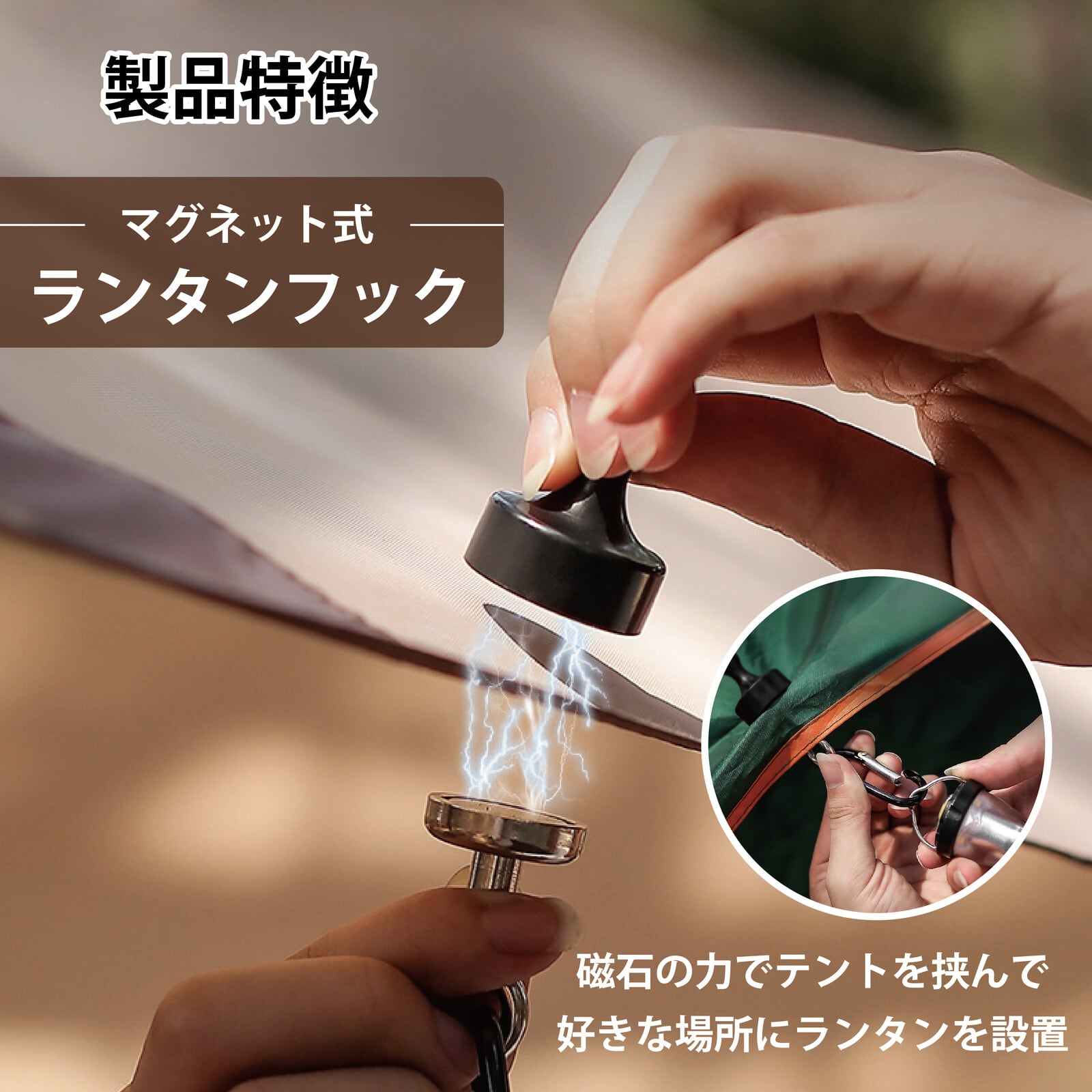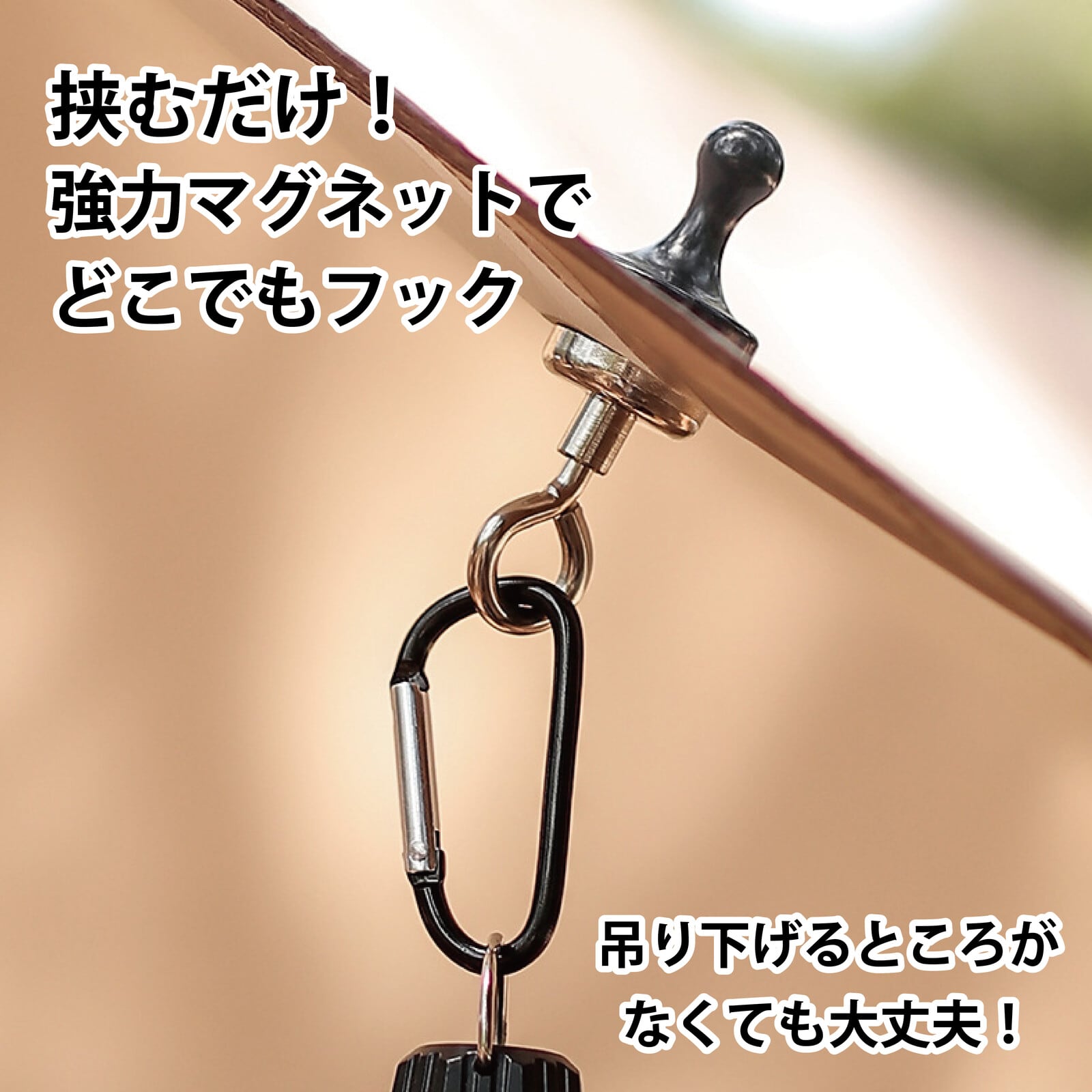 【強力なマグネット付き】強力なマグネットを採用。最大4kgまでの小物を吊り下げるフックとしてキャンプ、アウトドアに適用します。